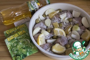 Перемешиваем ножки с травами и маринадом, добавляем нарезанный на крупные дольки лук, лимон (можно половинку) и целые оливки. Немного солим и перчим.