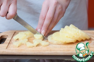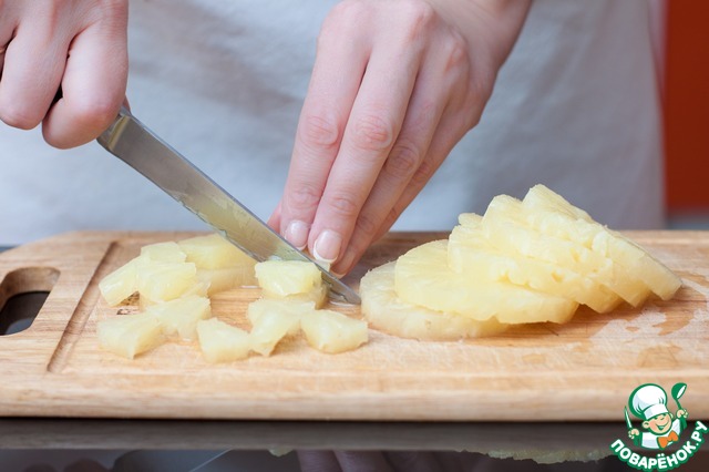 Ананас откинуть на дуршлаг, сироп сохранить, мякоть нарезать небольшими кусочками