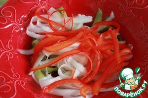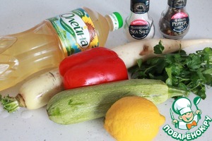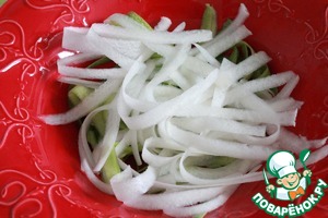 Дайкон и кабачок делаем одинаковой длинны. Дайкон очищаем от кожуры. Кабачок, если молодой оставляем с кожурой.
