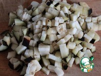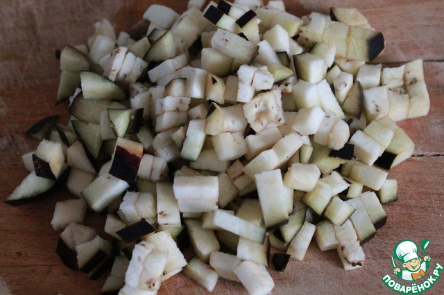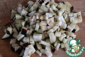 Баклажан предварительно вымачиваем в подсоленной воде. Нарезаем мелким кубиком. |