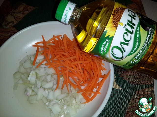Для начала нальем в сковороду масло "Олейна" и обжарим лук с морковью. Охладим