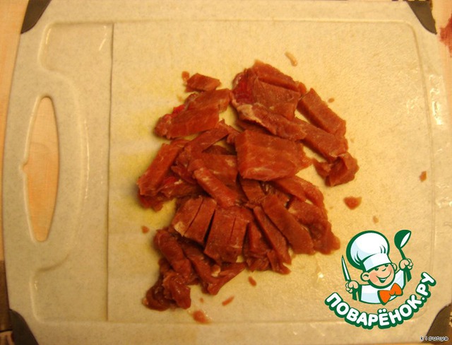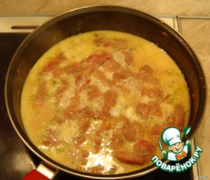 Мясо нарезать полосками. Залить мясо взбитым яйцом со специями, перемешать все и дать постоять полчаса.