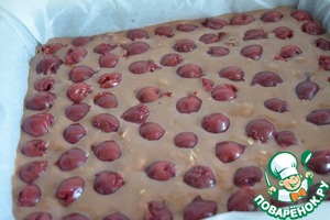 Форму 20*30 см, застилаем бумагой для выпечки и выливаем тесто. Сверху выкладываем вишни, вдавливая их в тесто.
