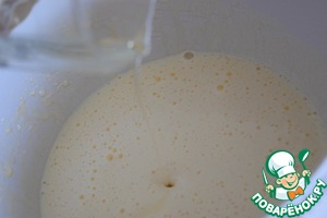 В яичную массу добавить растительное масло, минеральную воду - перемешать.