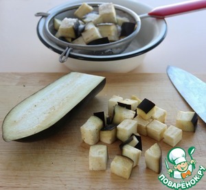 Баклажаны нарежьте кубиками со стороной 2 см, положите в дуршлаг или сито, щедро посыпьте солью, оставьте на 20 мин.