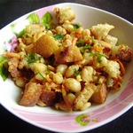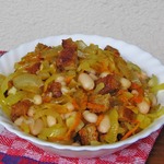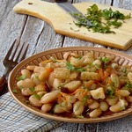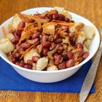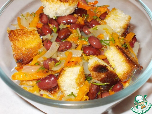 Теплый салат с добавлением хлебных сухариков и фасоли. Такой салат запросто сможет разнообразить меню в пост.