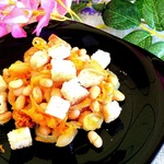 Добавляем к моркови и сухарикам лук. Высыпаем фасоль. Добавляем соевый соус Киккоман. Перемешиваем салат и в теплом виде подаем к столу.