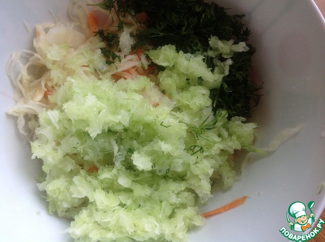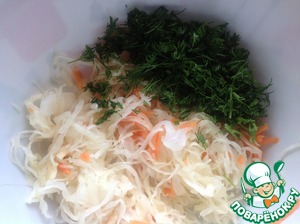 В салатник выложить капусту, отжав от лишней жидкости. Нашинковать мелко укроп