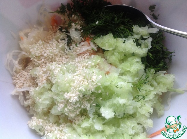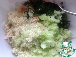 Добавить масло и кунжут. Перемешать тщательно салат.