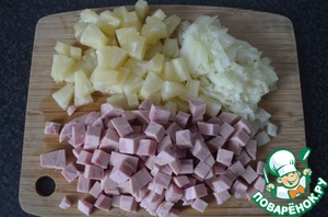 Лук репчатый почистить и мелко нарезать. Ананас нарезать мелкими кусочками, ветчину небольшими кубиками.