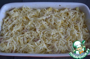 Достать из духовки, перемешать, посыпать тёртым сыром и опять вернуть в духовку, примено на 25 минут до румяной корочки.