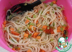 Спагетти разломать пополам и варить в подсоленной воде 10 минут. По истечении 7 минут добавить к макаронам морковь и сельдерей. Варить вместе 3 минуты. Затем воду слить. Смешать с помидорами и заправкой.
