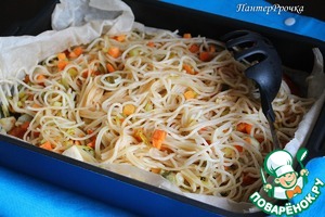 Подготовить 2 листа пергамента (размером больше формы), немного смазать их маслом. На один выложить спагетти с овощами, сверху накрыть вторым листом, края завернуть. Готовить в предварительно разогретой при 200 градусах духовке 15 минут.