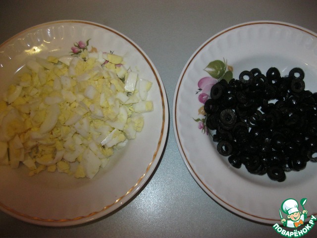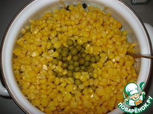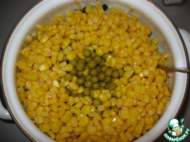 Все перемешать, добавить горошек и кукурузу. Заправить майонезом.