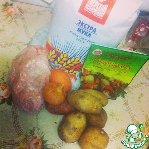 Вот наши ингредиенты! Картофель, мука и яйцо для теста! (картофель должен быть средний, у меня маленький, потому что другого не было) Лук и специи для фарша! ( здесь дело на любителя, я беру "приправа к фаршу", когда нет заменяю чем-нибудь другим).