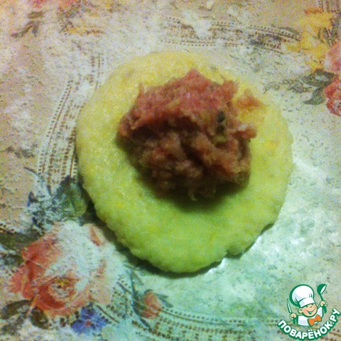 Тесто разделяем на маленькие комочки. Из такого комочка формируем лепешку, кладем в середину фарш...