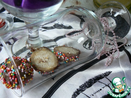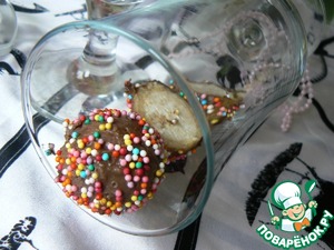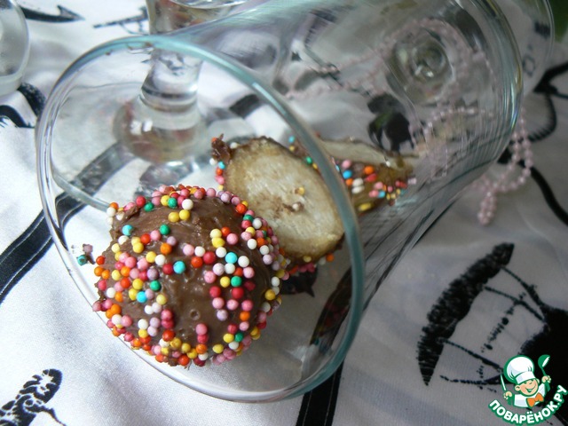 • Шоколадную пасту подогреть в микроволновке до состояния жидкой сметаны. Каждый шарик надеть на шашлычную палочку или шпажку и окунать в пасту. Посыпать кондитерской посыпкой или украсить сливками или кремом. Затем для удобства я вставляла в перевернутый дуршлаг.