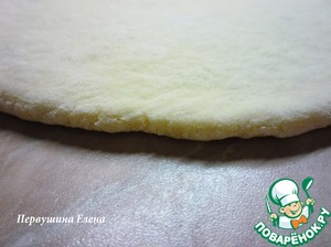 Положить тесто на стол, накрыть пищевой плёнкой и раскатать в пласт,