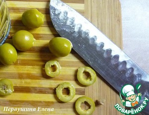 Оливки нарезать тонкими кружочками и