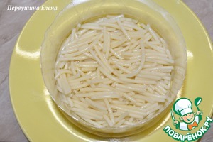 Отварить вермишель. Поставить форму для салатов в тарелку и начать выкладывать салат слоями. Сперва отварную вермишель. -