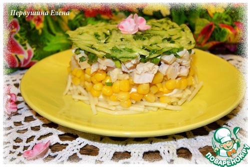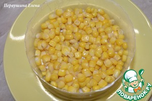 Нанести майонезную сетку и сверху выложить кукурузу. Слегка придавить слои.