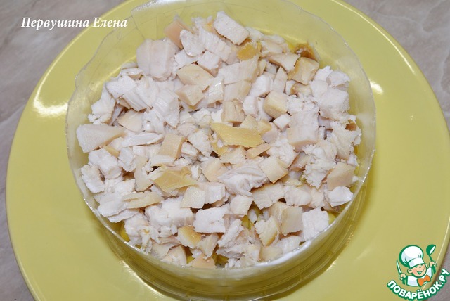 Третьим слоем выложить нарезанный мелкими кубиками окорочок. Нанести сетку майонеза и выложить нарезанный тонкими колечками белую часть пучка зеленого лука.