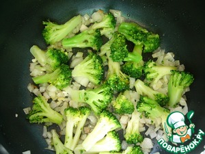 Добавить предварительно размороженную (я размораживаю в микроволновке 1 минуту пока обжаривается лук с чесноком) и разобранную на небольшие соцветия брокколи и продолжать обжаривать