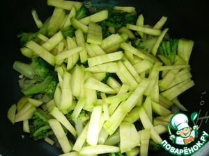 Добавить нарезанный мелкими кусочками кабачок (чтобы быстрее обжарился)и натёртый свежий имбирь. Всё перемешать и обжаривать до сигнала