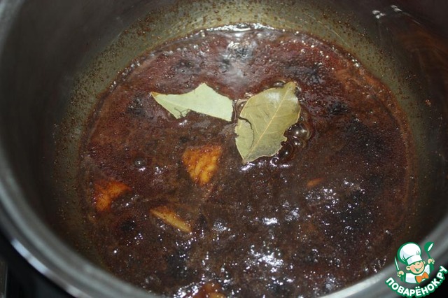 Подготовить мясо, удалить кости, нарезать нетолстыми кусками с кожей. Залить маринадом и поставить в холодильник на 5-7 дней. Ежедневно переворачивать.