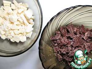 Измельчим шоколад на мелкие кусочки в две разные емкости. Я разнообразия ради сделала конфеты из двух видов шоколада, но конечно же, вполне возможно взять 260 г шоколада только одного вида. Помадка из белого шоколада не только по форме, но и по вкусу получается очень похожей на классическую помадку в коробках, почти такой же сливочной и ароматно-цитрусовой.