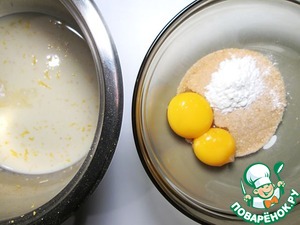 К сливкам добавляем мелко тертую цедру одного лимона. По желанию 20 мл сливок можете заменить на любой ликер или ароматный сироп. К сахару добавляем желтки 2-х яиц и щепотку ванилина. Я добавила еще 1 ч. л. с верхом крахмала, чтобы крем был погуще и не свернулся, но это вовсе необязательно.