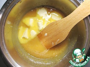 Нагреваем до теплого состояния сливки с цедрой, желтки растираем с сахаром и ванилином. Заливаем, не переставая перемешивать, желтковую массу сливками и переливаем ее обратно в кастрюлю. Помешивая, доводим массу до загустения, но не кипятим. Добавляем в крем нарезанное кусочками сливочное масло и перемешиваем до гладкой консистенции.