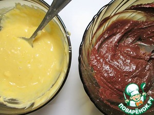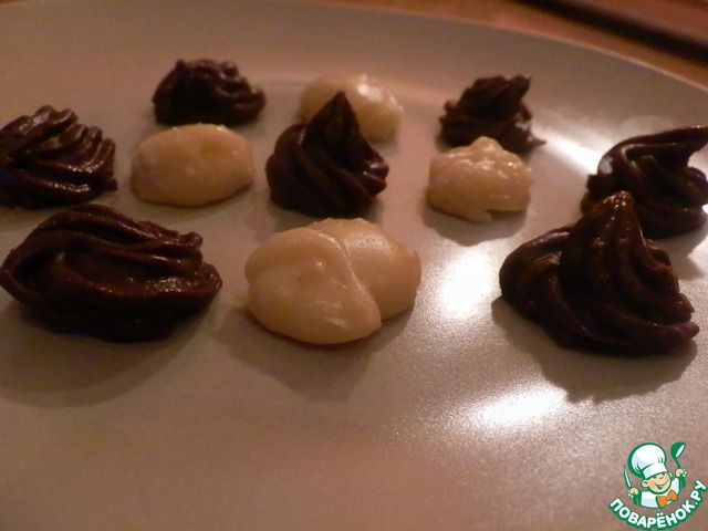 Добавляем в каждую миску с шоколадом по 1/2 неостывшего заварного крема, перемешиваем до растворения шоколада. Если кусочки шоколада все же остались, подогрейте немного смесь и перемешайте.