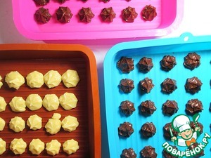 Далее вы можете переложить шоколадную массу в силиконовую форму, и после того, как она застынет, ее нарезать, или сразу распределить ее по формочкам для конфет. Мне захотелось придать форму конфетам при помощи кондитерского шприца с насадкой "звездочка". Для этого я немного остудила шоколадный крем, переложила в шприц и отсадила небольшие конфетки. Получилось более 80 штук.
