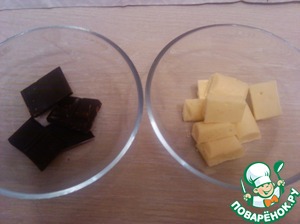Теперь берем белый и темный шоколад, ломаем его на кусочки и топим на водяной бане