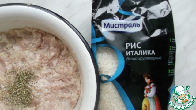 Отварить рис до готовности (я брала "Италика" от "Мистраль", зерно отлично держит форму), подготовить фарш.