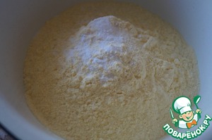Перемешать кукурузную и пшеничную муку вместе с содой.