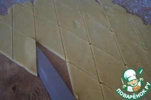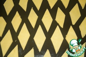 Раскатать тесто в тонкий пласт и ножом нарезать из него ромбы. Посыпать их крупной солью и немного придавить её рукой. (если вы хотите сладкое печенье, посыпайте его сахаром)