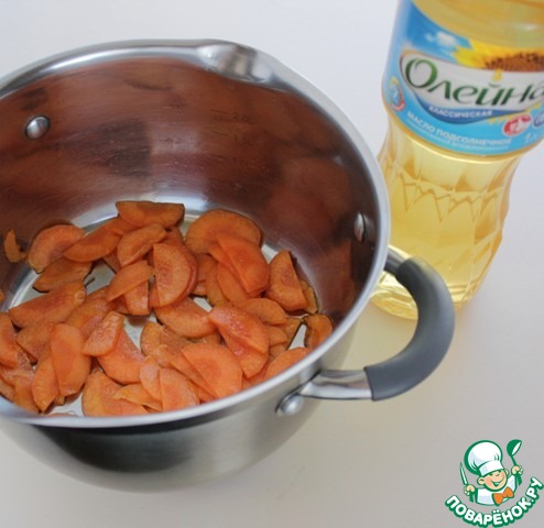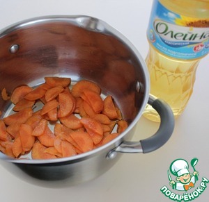 В кастрюлю налить подсолнечное масло Олейна и припустить морковь до мягкости.