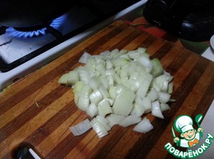 Лук режется небольшим кубиком и добавляется в мясо. Жарится до золотистого цвета