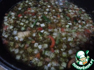 После того, как мясо сварилось и стало мягкое и нежное, в бульон засыпаете замороженные овощи, кладете маш и рис