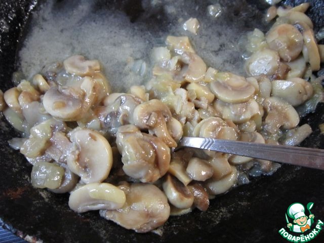 К луку выложить шампиньоны и протушить, не доводя до стадии зажаренности. (у меня шампиньоны были замороженные)