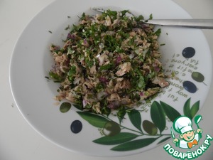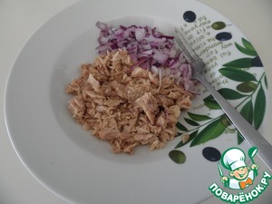 Откройте банку с тунцом, не много разомните вилкой, нарезать лук перемешать