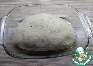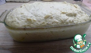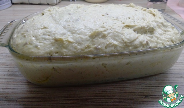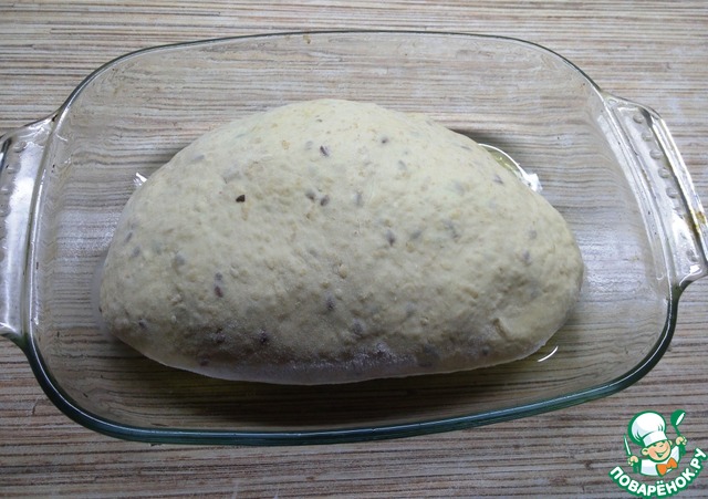Тесто положить в форму для запекания. Накрыть пленкой и оставить подниматься на час-полтора, пока тесто не увеличится в 2 раза. У меня форма 17х23 см