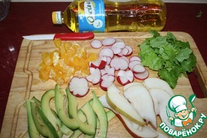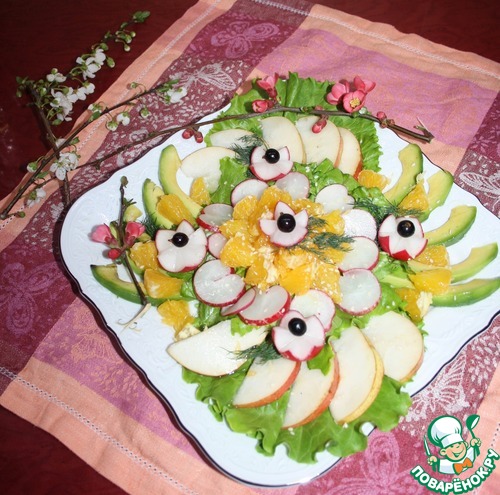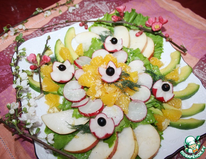 Авокадо очистить от кожуры, нарезать дольками. Грушу очистить от сердцевины, нарезать дольками. Апельсин очистить от внутренней кожицы, нарезать треугольничками. Салат порвать на кусочки (оставить часть для украшения). Редис порезать кружочками. Можно также вырезать несколько цветочков. Выложить листья салата, авокадо и груши. Порванные листья салата и редис заправить маслом посолить, перемешать, выложить в центр. Сверху - апельсины. Весь салат взбрызнуть растительным маслом "Олейна" и соком лимона, посыпать кунжутом Авокадо присолить. Выложить цветы из редиски. Я украсила цветы смородиной.