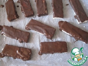 Застывшую смесь нарежем на прямоугольные кусочки одинакового размера. Снова накроем противень плёнкой и уберём в морозилку на ночь.
