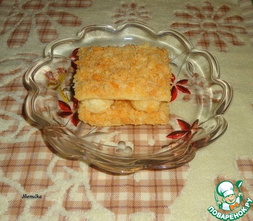 Берем один квадратик, смазываем его сгущенкой и обсыпаем крошкой. Этот квадратик кладем на творожные шарики и слегка придавливаем.