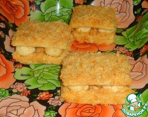 Тесто разделить на несколько частей. Каждую часть раскатываем и разрезаем на равные квадратики. При этом раскатываем тонко. Квадратики и неровные обрезки выпекаем в духовке до готовности, они немного подрумянятся снизу. Обрезки подсушите дольше, чтобы они хорошо крошились.