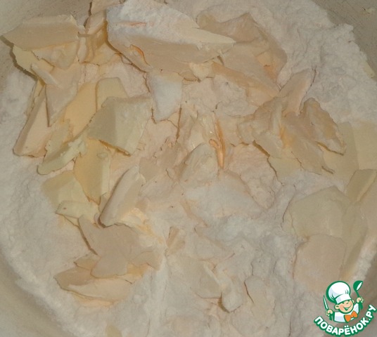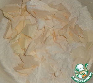 Приготовим тесто. В миску высыпаем муку и добавляем к ней кусочки маргарина. Перетираем массу в крошку.