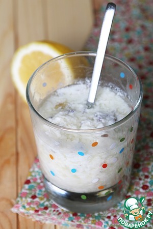 А перед самым началом приготовления подогреем лавандовое молоко где-то до 40 градусов в микроволновке и добавим столовую ложку лимонного сока, чтобы молоко превратилось в пахту - незаменимую вещь при выпечке.